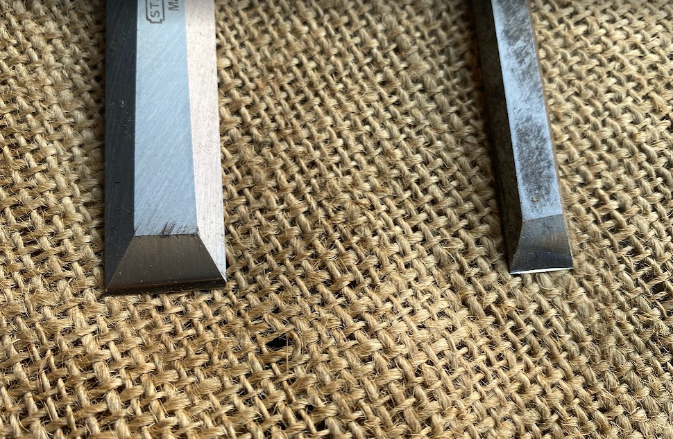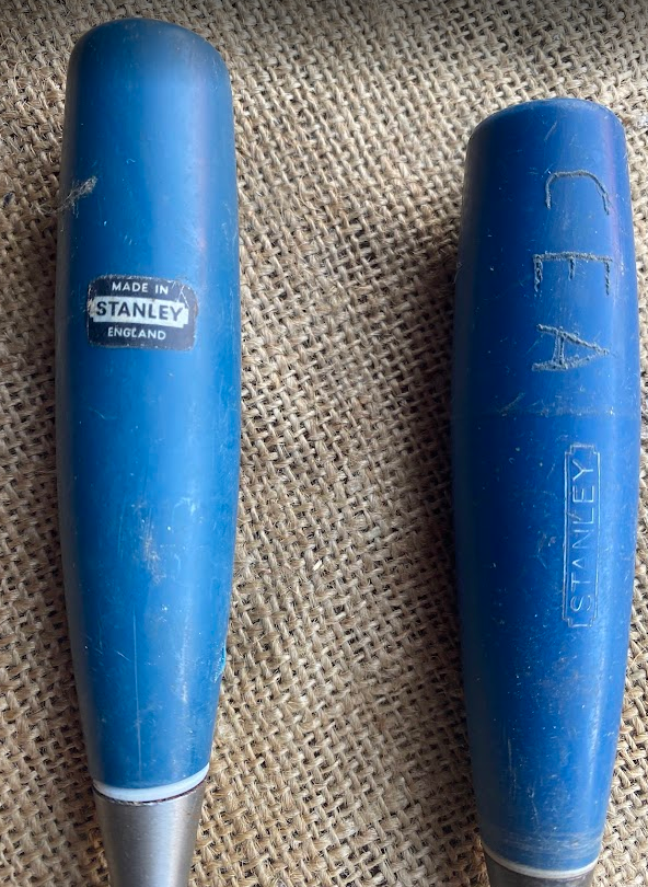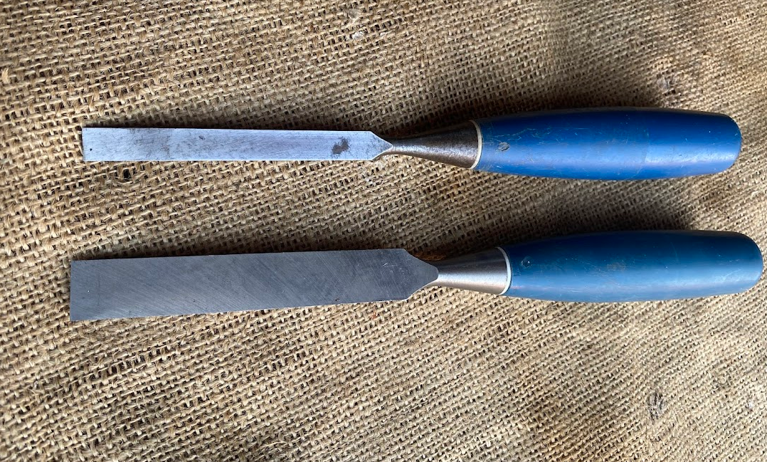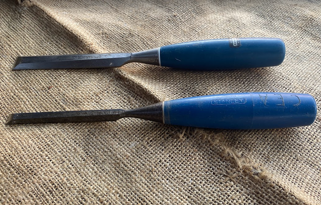 2 x Vintage Stanley Blue Bevel Edged Chisels. 3/4″ in great condition and 7/16″ in good usable fettle as well. Solid, good users and sharp.