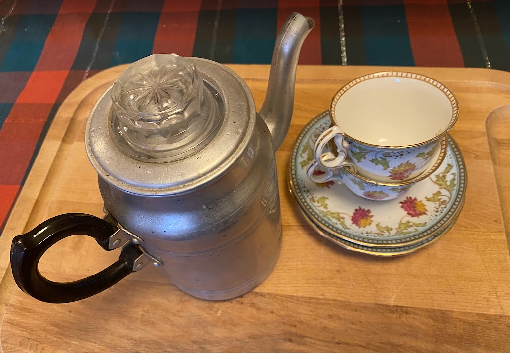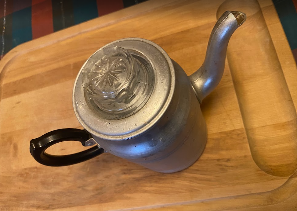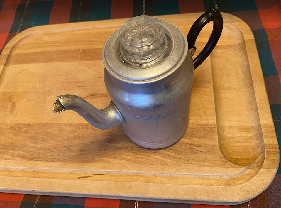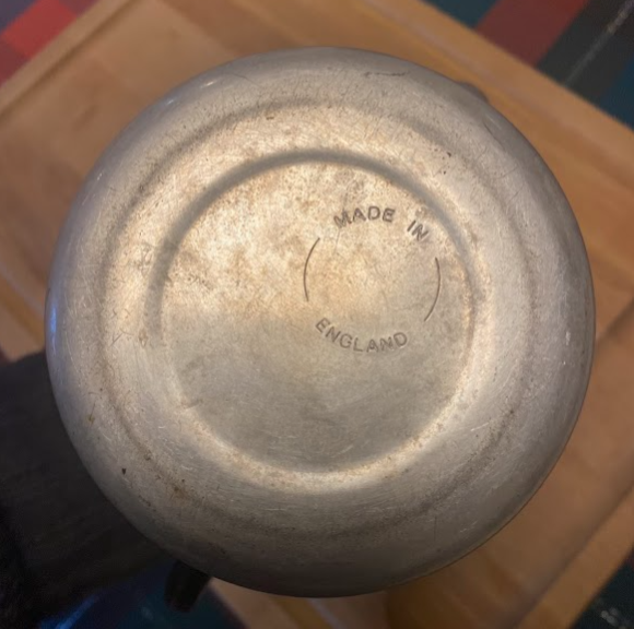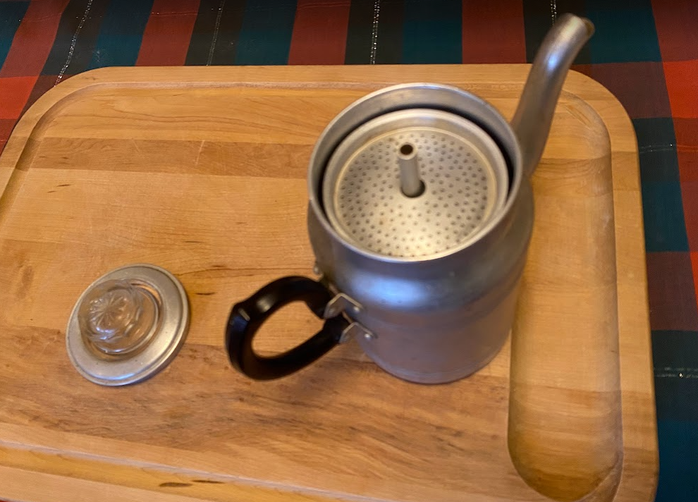 Nice example of a Vintage Coffee Pot Perculator in alloy. Lovely looking and nicely made with a moulded handle and glass knob to the lid. All parts correct and standing at 7″ tall to top of the knob. No maker’s mark I can see.