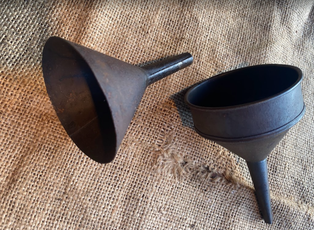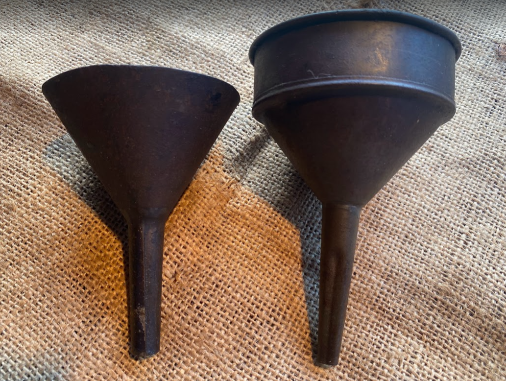 2 nice Vintage Metal Funnels each around the 3″ diameter mark as pictured. Solid, robust. Do what they were meant to do. Not a lot else to say other than being much better than modern plastic crap.