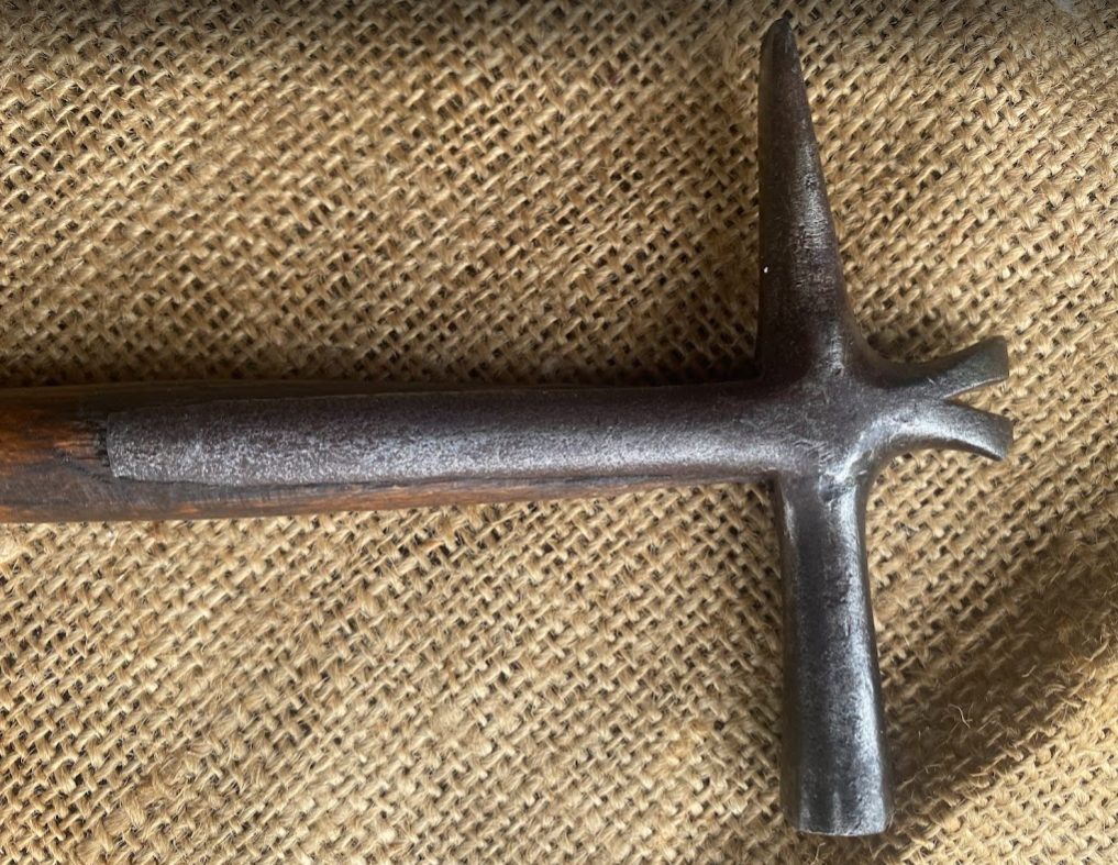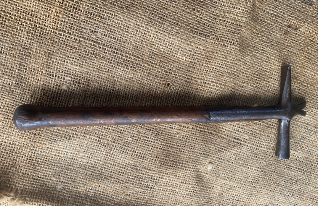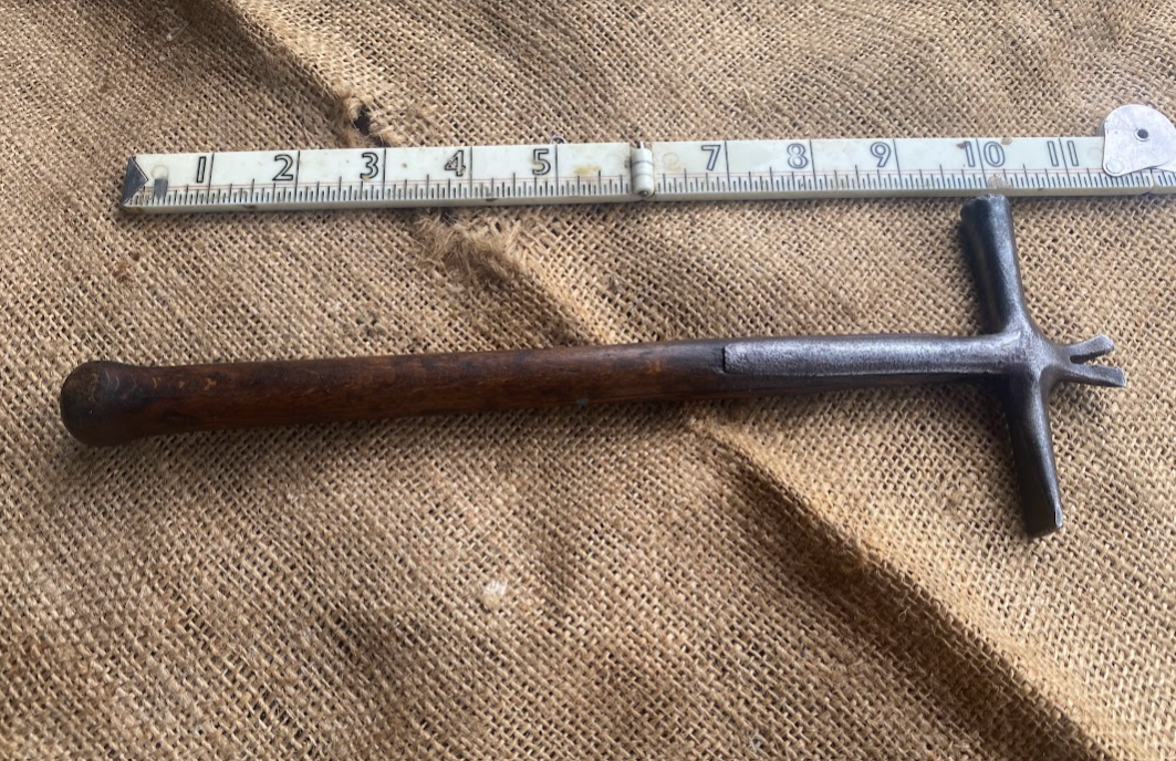 Nice one this Wynn Timmins Upholstery Hammer. Done lots of work, I’m sure, but it’s worn well. Looks to be an original shaft with a strapped head that includes tack puller. Partial mark on the head, but it’s a Timmins. Nice thing.